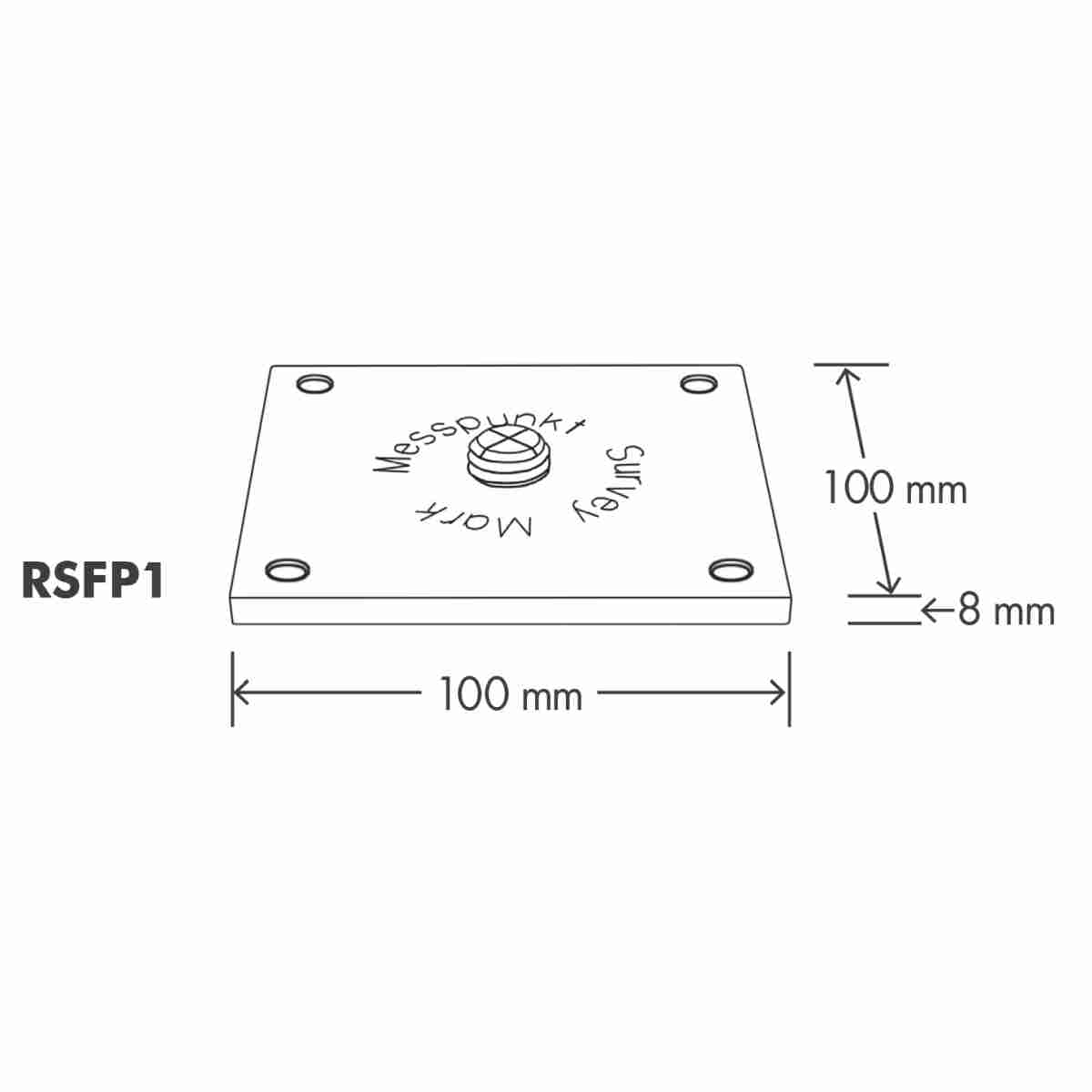 Der Fixpunkt RSFP1 hat ein 5/8“-Edelstahlgewinde zum Aufschrauben eines Prismas oder eines Messinstruments. Wird die Platte als Fixpunkt am Boden verwendet, kann sich der Vermesser mit dem Stativ exakt über dem Kreuz positionieren.