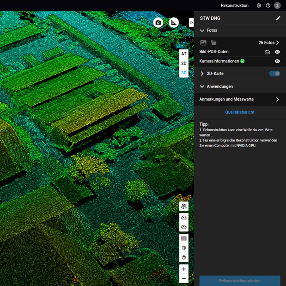 Die Software bietet eine breite Palette von Funktionen, darunter automatische Flugplanung, Bildverarbeitung, Punktwolkenrekonstruktion und vieles mehr. Mit DJI Terra können Sie präzise Höhenmodelle und Oberflächenmodelle erstellen, um Gelände und Gebäude in bisher unerreichter Genauigkeit zu erfassen. Verwandeln Sie Ihre Drohnenflüge in wertvolle Informationen mit DJI Terra.