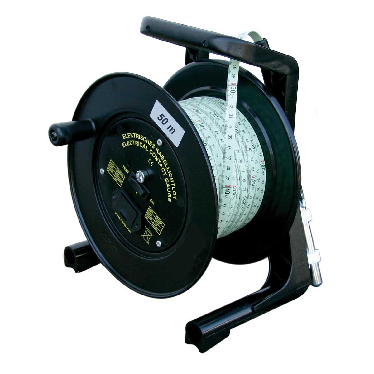 Elektrisches Kabellichtlot 50 m zum Messen von Wasserständen in Brunnen, auch bei Störgeräuschen. Berührt die Sonde die Wasseroberfläche, leuchtet an der Aufrollvorrichtung bei eingeschaltetem Gerät eine Diode auf und ein Summer ertönt. Diese können nur durch das Wasser eingeschalten werden. Lampe und Summer erlöschen sofort wenn die Sonde aus dem Wasser gezogen wird.