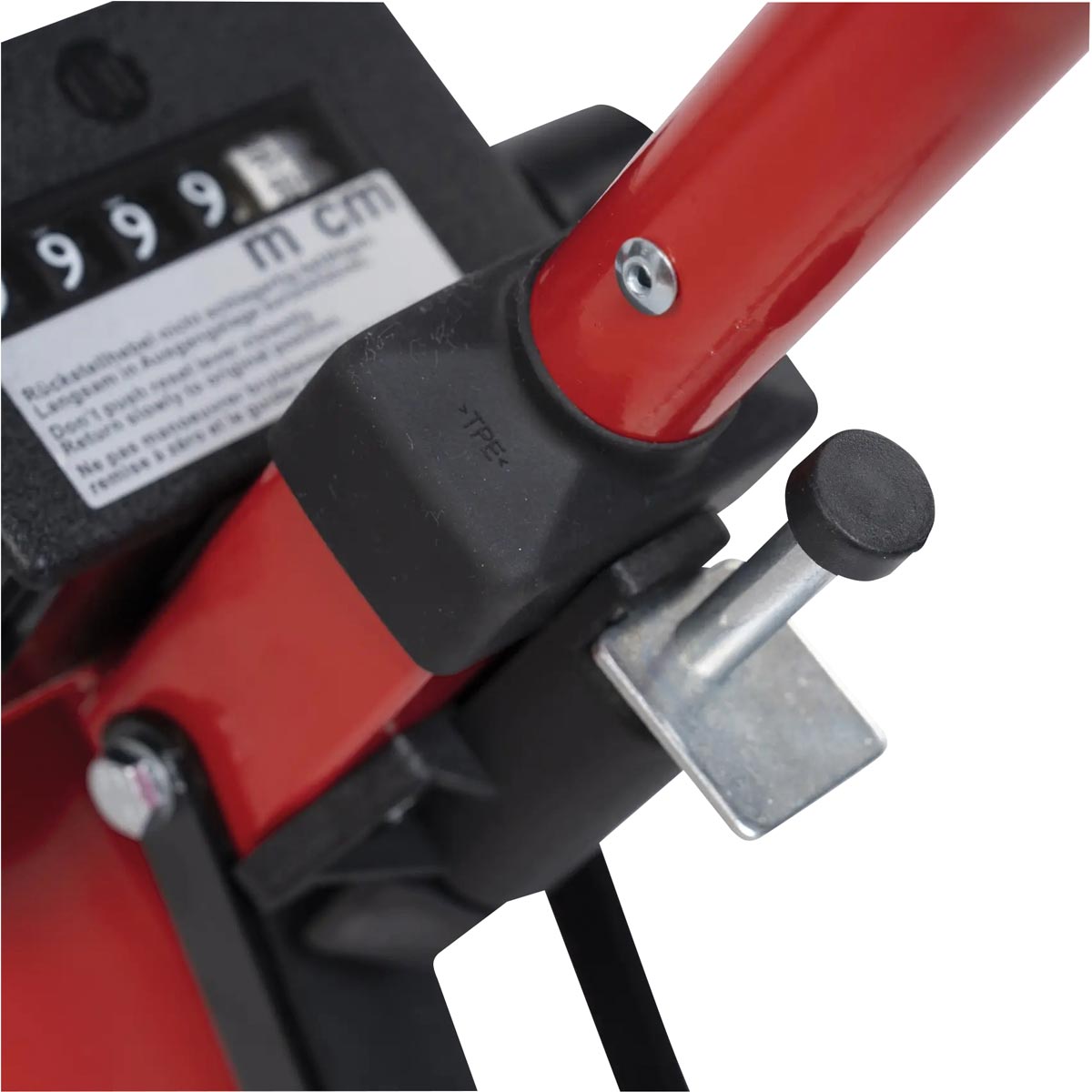 Das Messrad wird mithilfe einer Führungsstange entlang der Messstrecke gerollt. Die Führungsstange ist einklappbar, was Transport und Handhabung erleichtert. Für einen sicheren Stand sorgt der praktische Abstellbügel, der sich unkompliziert nach hinten klappen lässt, zusätzlich ist eine Bremse integriert.