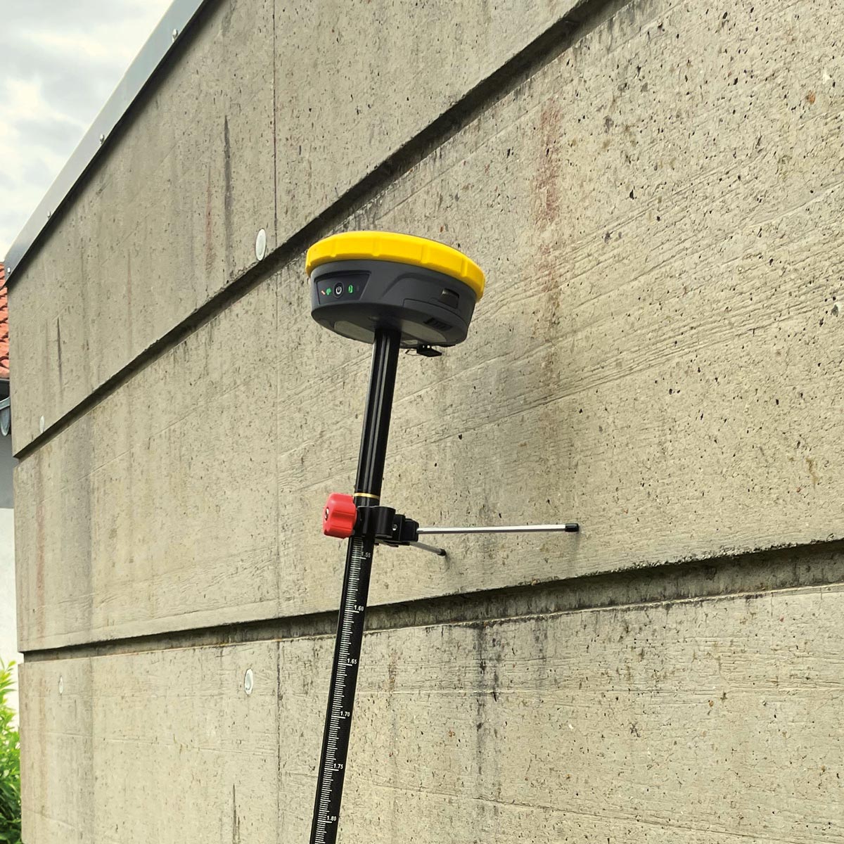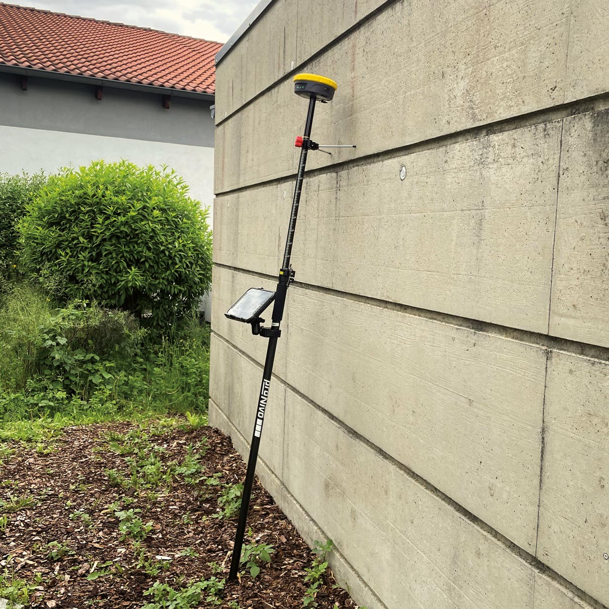 - Verhindert Umfallen von Prismen- und GPS-Stäben an Wänden