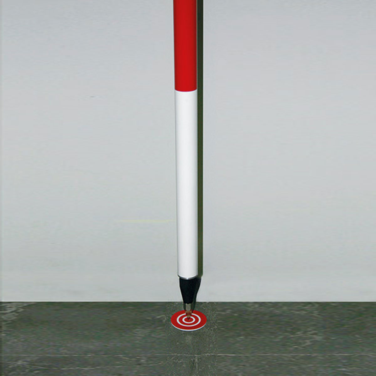 Markieren des Lotpunktes. Dazu können verschiedene Hilfsmittel verwendet werden. Entweder eine Klebemarke oder ein Bolzen, der in den Boden einbetoniert wird (mit wiederholter Überprüfung des Lotpunktes und gegebenenfalls Einrichten der Justagehalterung durch Lösen und Spannen der Schrauben).