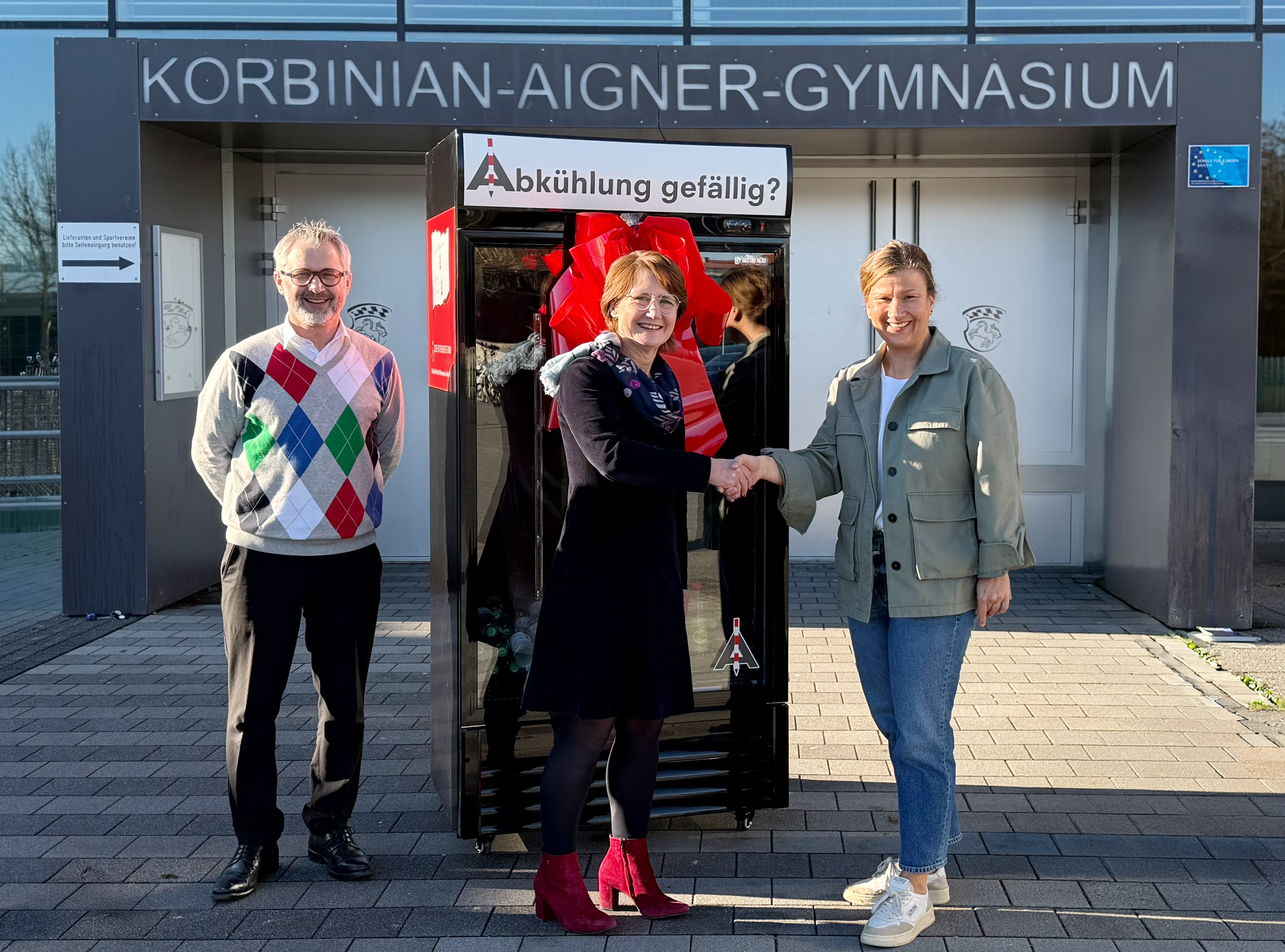 St. Wolfgang, 08.02.2026 – Ob Schulfest, Theateraufführung oder Sportevent: Damit bei den Veranstaltungen am Korbinian-Aigner-Gymnasium (KAG) niemand auf dem Trockenen sitzt, haben wir von der Josef Attenberger GmbH Schützenhilfe geleistet. Da die Schule schon länger nach einer passenden Kühlmöglichkeit für den Getränkeverkauf suchte, haben wir kurzerhand einen neuen Kühlschrank gespendet.